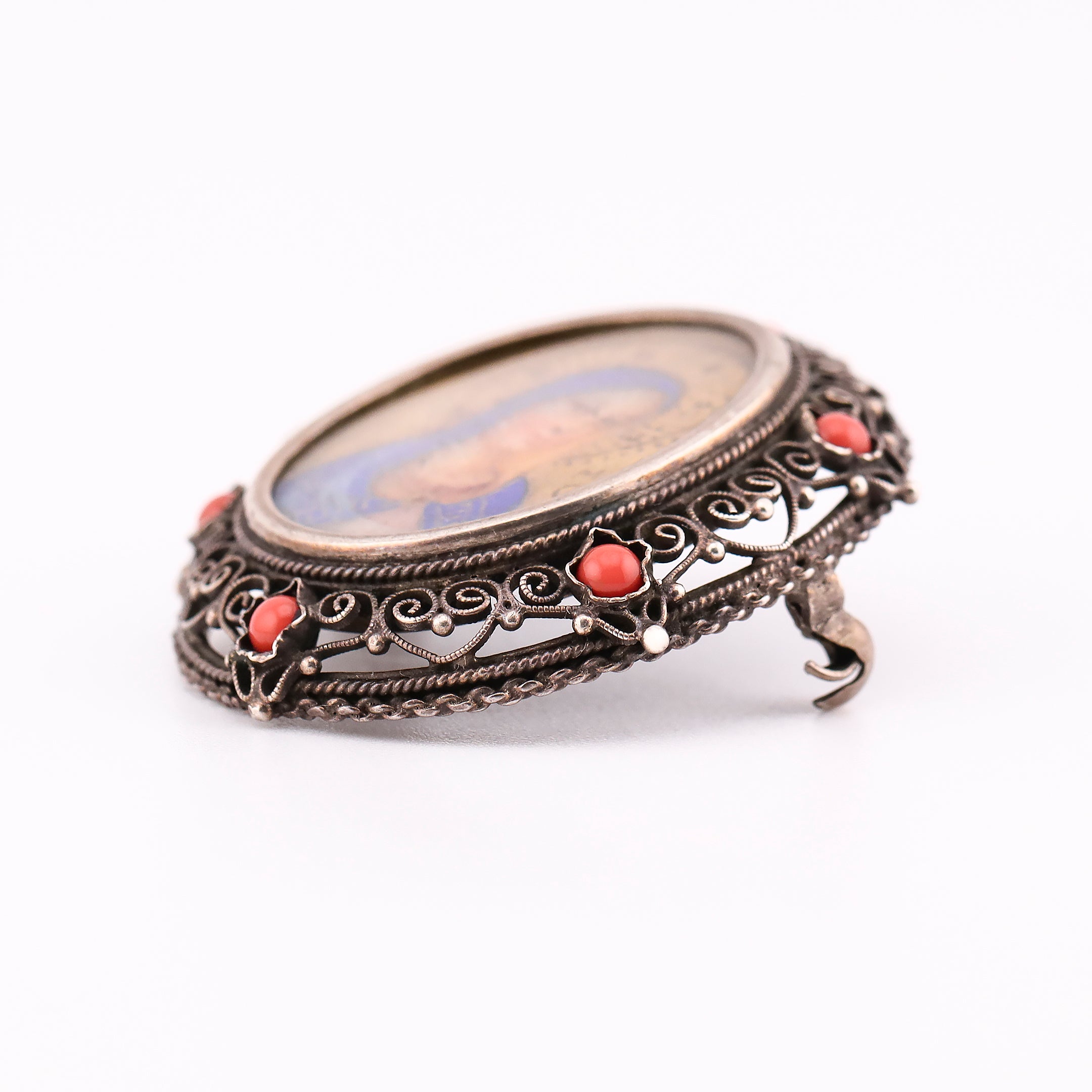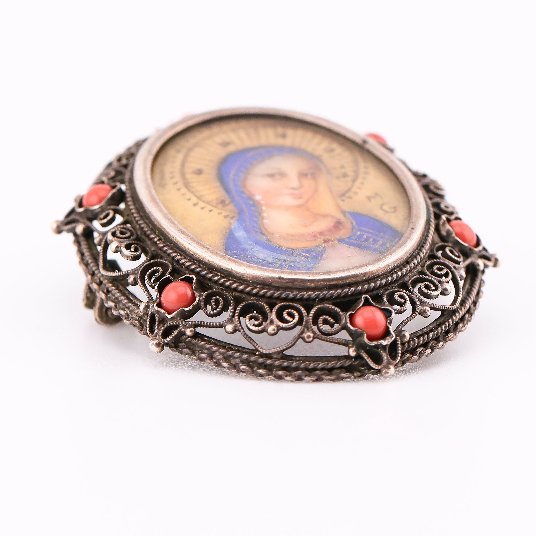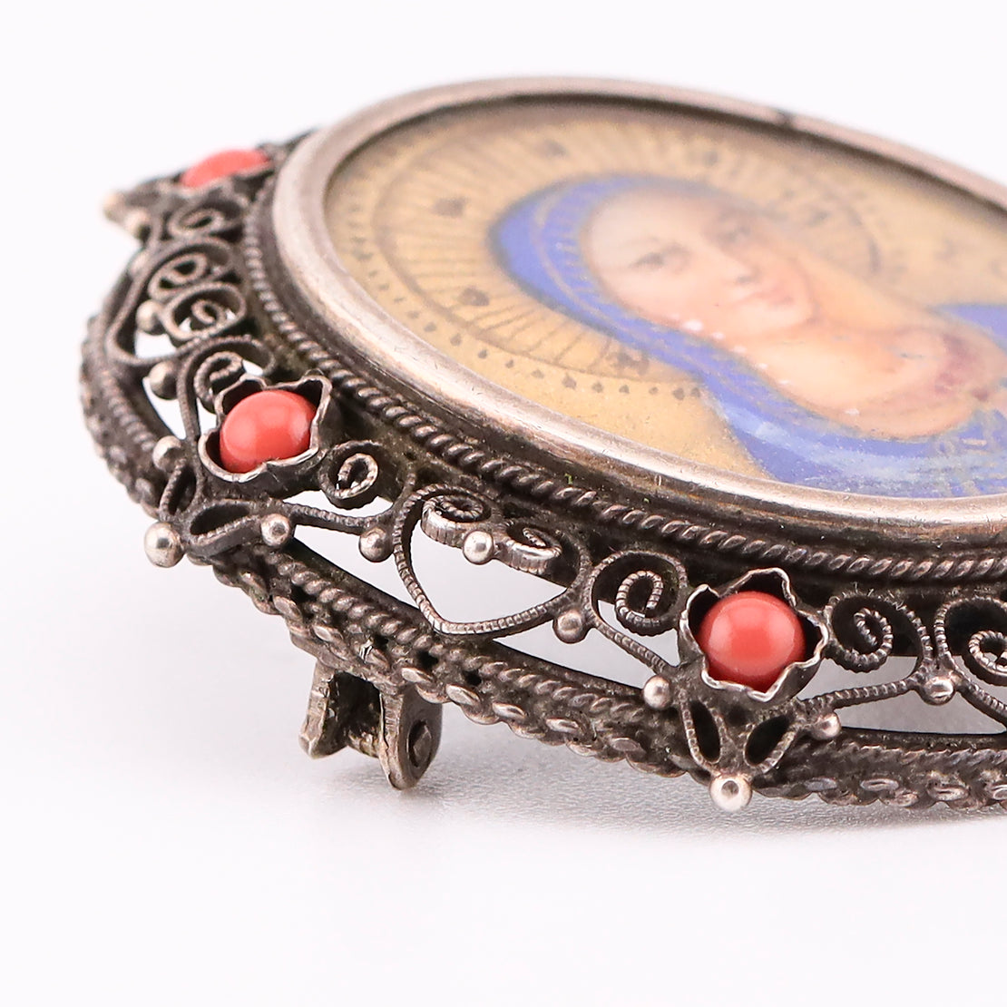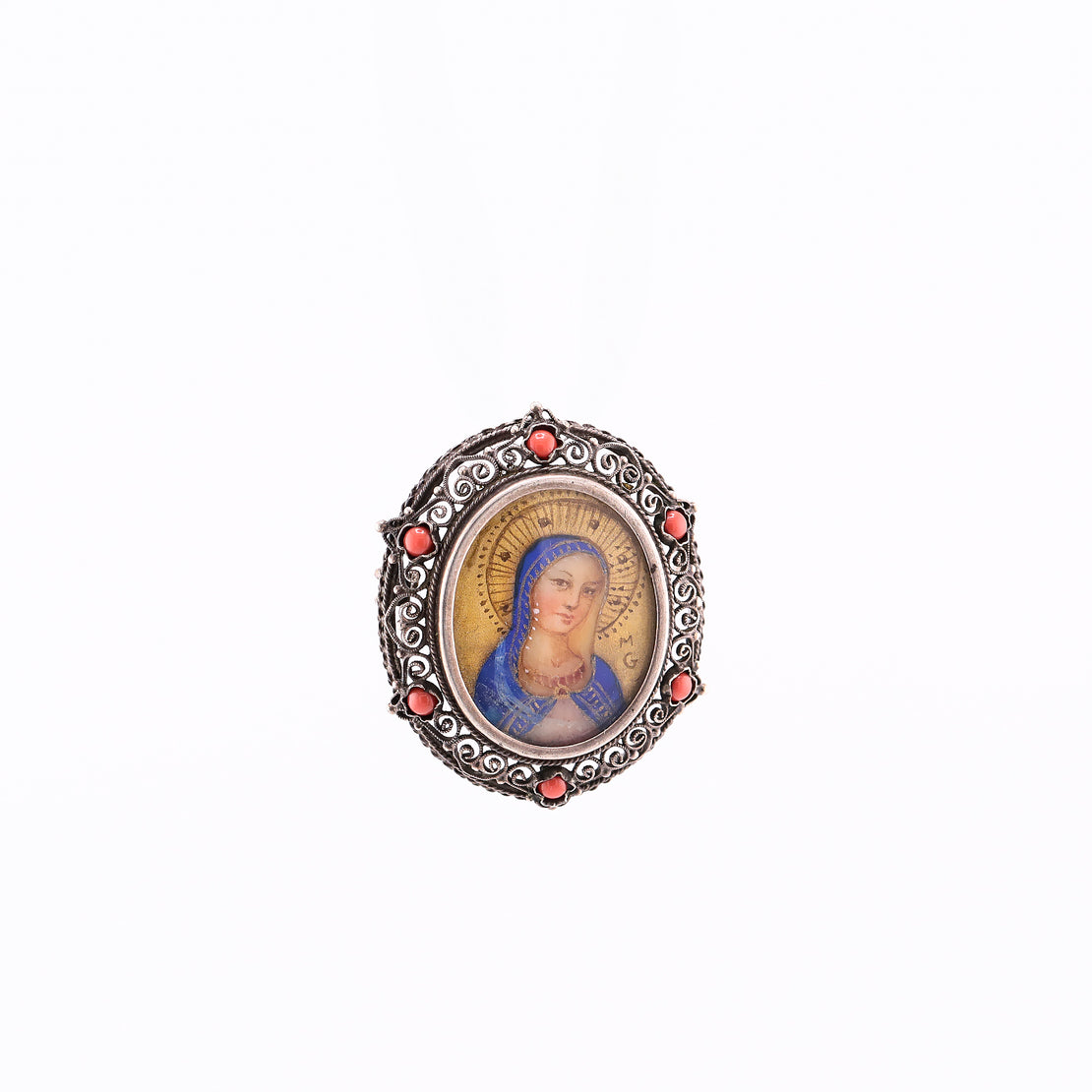 Pieza hecha a mano, proveniente directamente de Morton Subastas. Elaborada en plata 800, combina la técnica pictórica miniaturista con el trabajo artesanal de orfebrería. Presenta una pintura de la Virgen, realizada sobre metal y firmada con las iniciales MG, lo que sugiere la autoría de un taller o artista especializado en esmalte sobre plata.