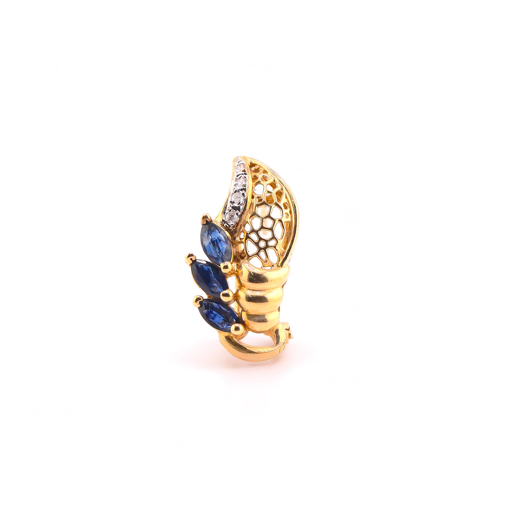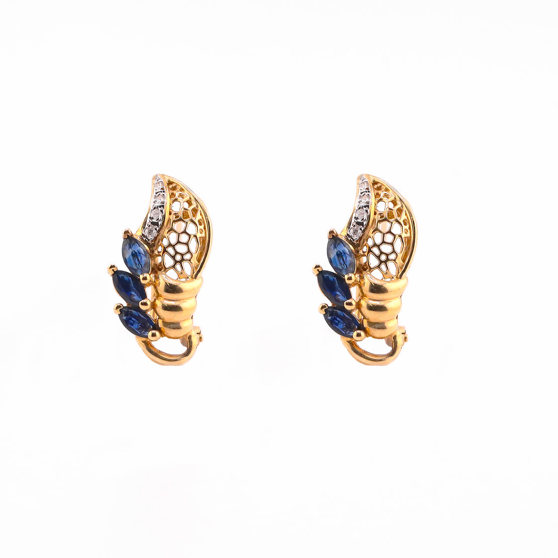 El par de aretes en oro amarillo de 14K, engastado con zafiros corte marquise y diamantes corte brillante, sobresale por su elegancia y equilibrio, creando un contraste refinado entre el azul profundo de los zafiros y la luminosidad del diamante.