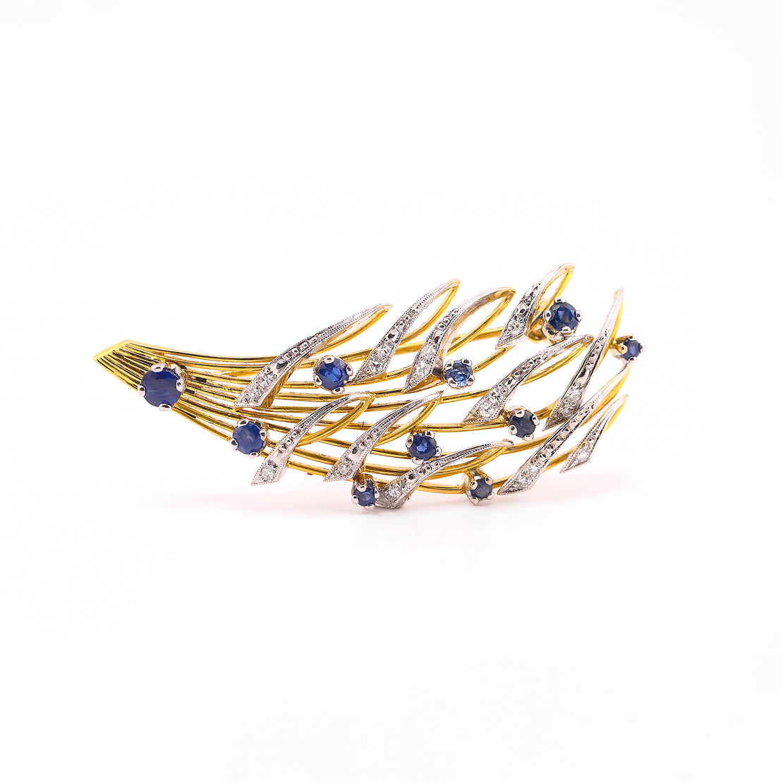 El prendedor en oro amarillo de 18K, con zafiros corte redondo y diamantes, presenta una composición más dinámica y escultórica, concebida como una pieza versátil y de fuerte carácter estético.