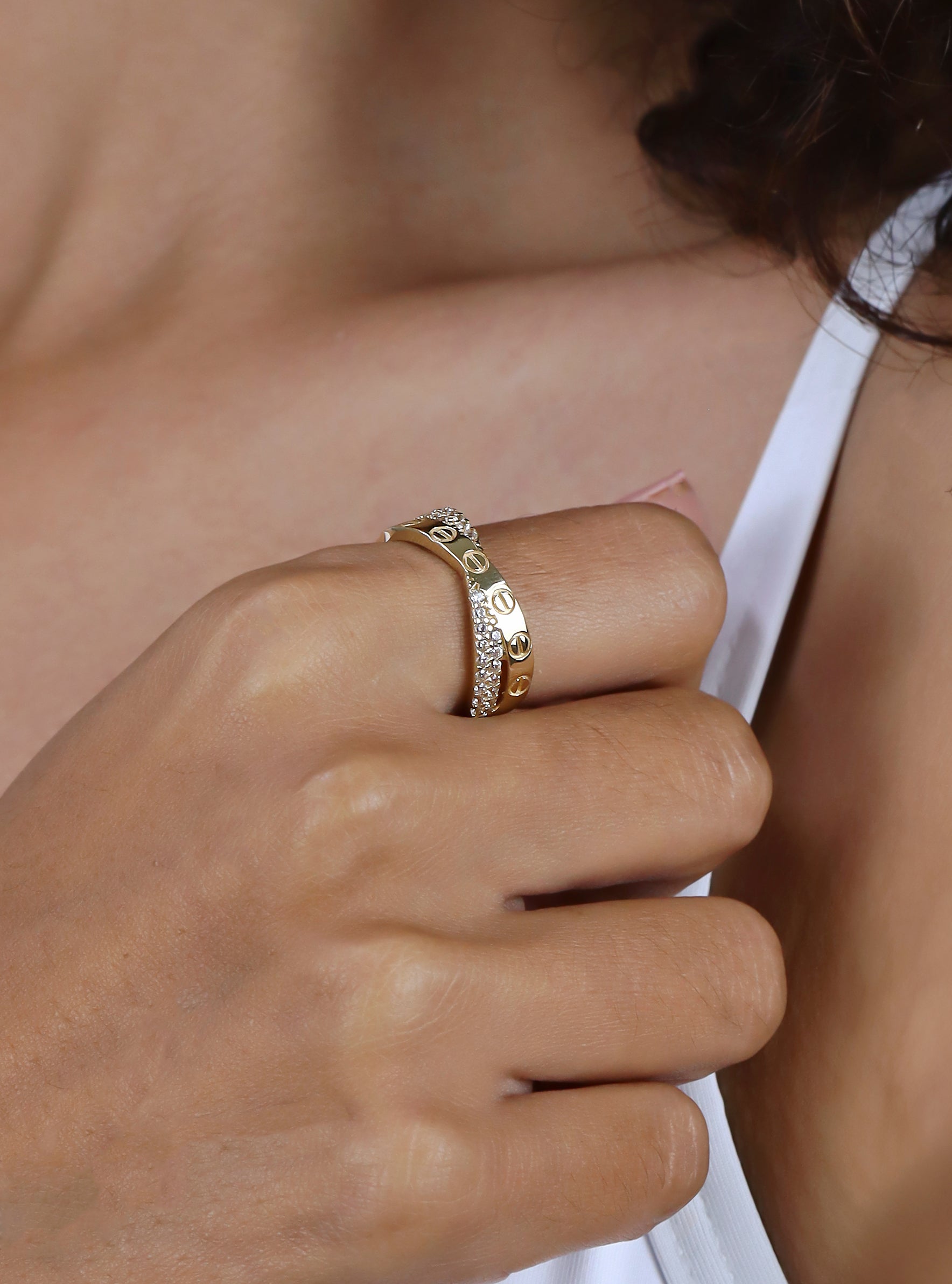 Anillo de Oro Círculo con Piedras Blancas de 14K