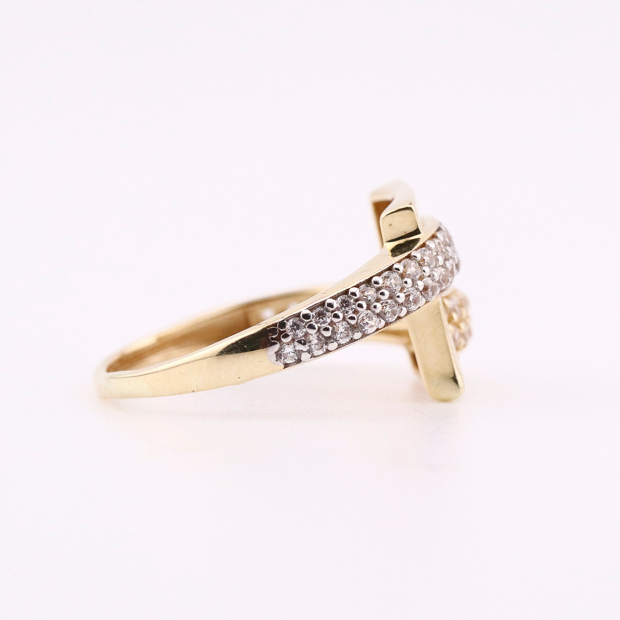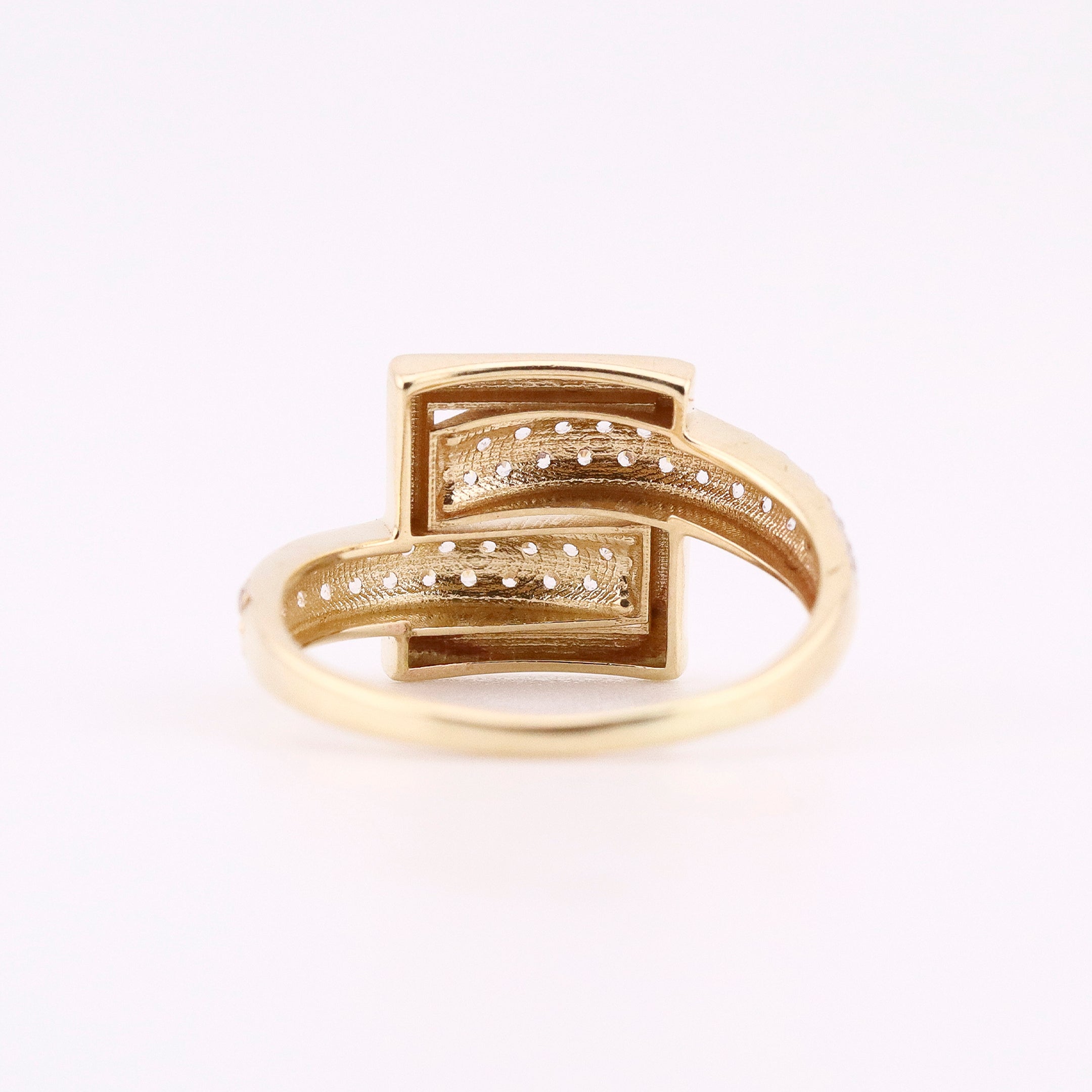 ¡Añade un toque de elegancia y sofisticación a tu estilo con nuestro anillo de oro amarillo de 14K! Con su diseño de cuadro entrelazado y las piedras blancas brillantes, este anillo es la opción perfecta para llevar en cualquier ocasión. ¡Hazte con el tuyo ahora!