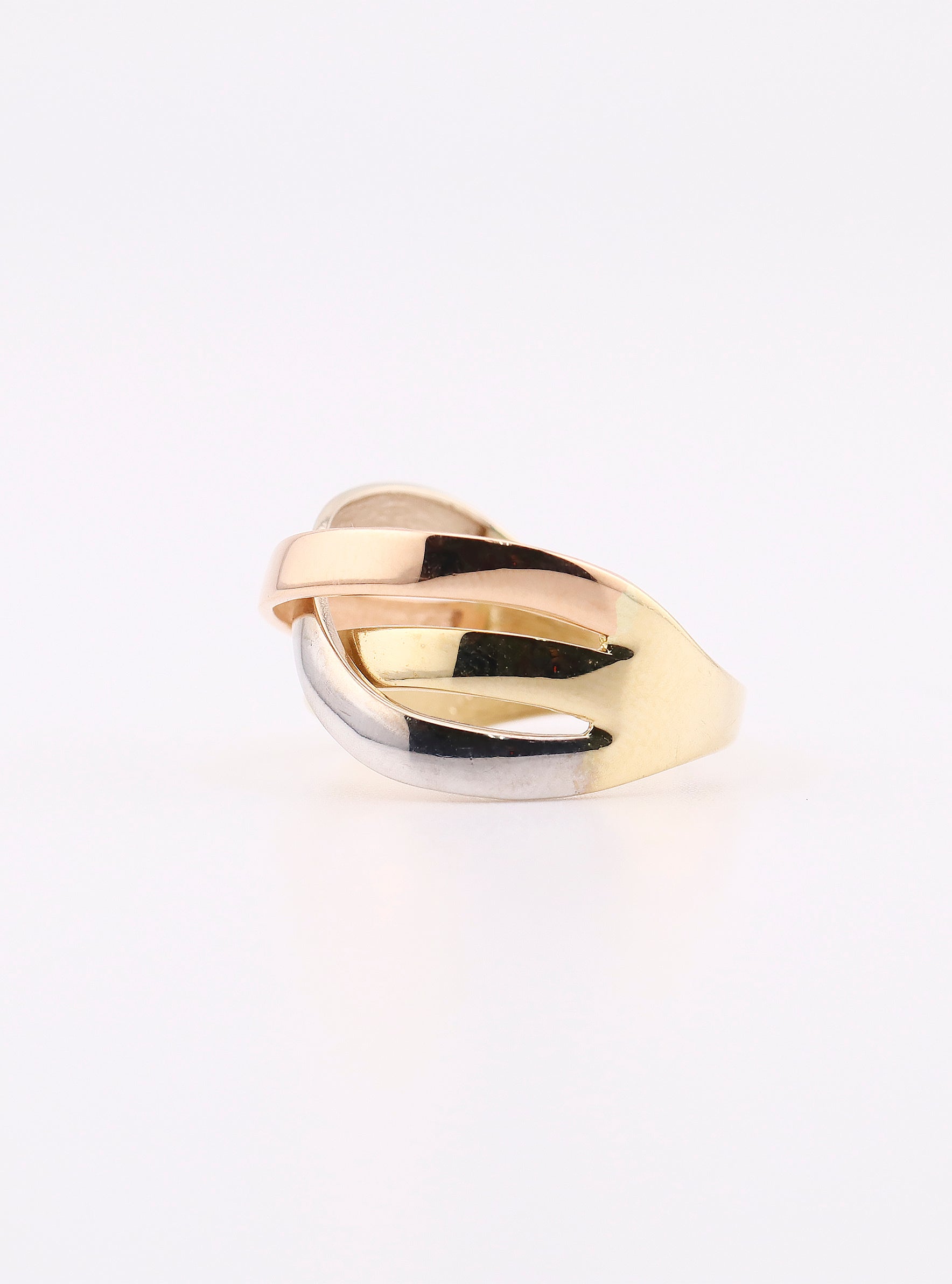 Estilo y elegancia se unen en nuestro anillo de oro enlazado de tres tonos. Hecho con oro amarillo de 14K y un peso de 2.9g, este anillo es una declaración de belleza y sofisticación. Dale un toque único a cualquier atuendo con este impresionante anillo.