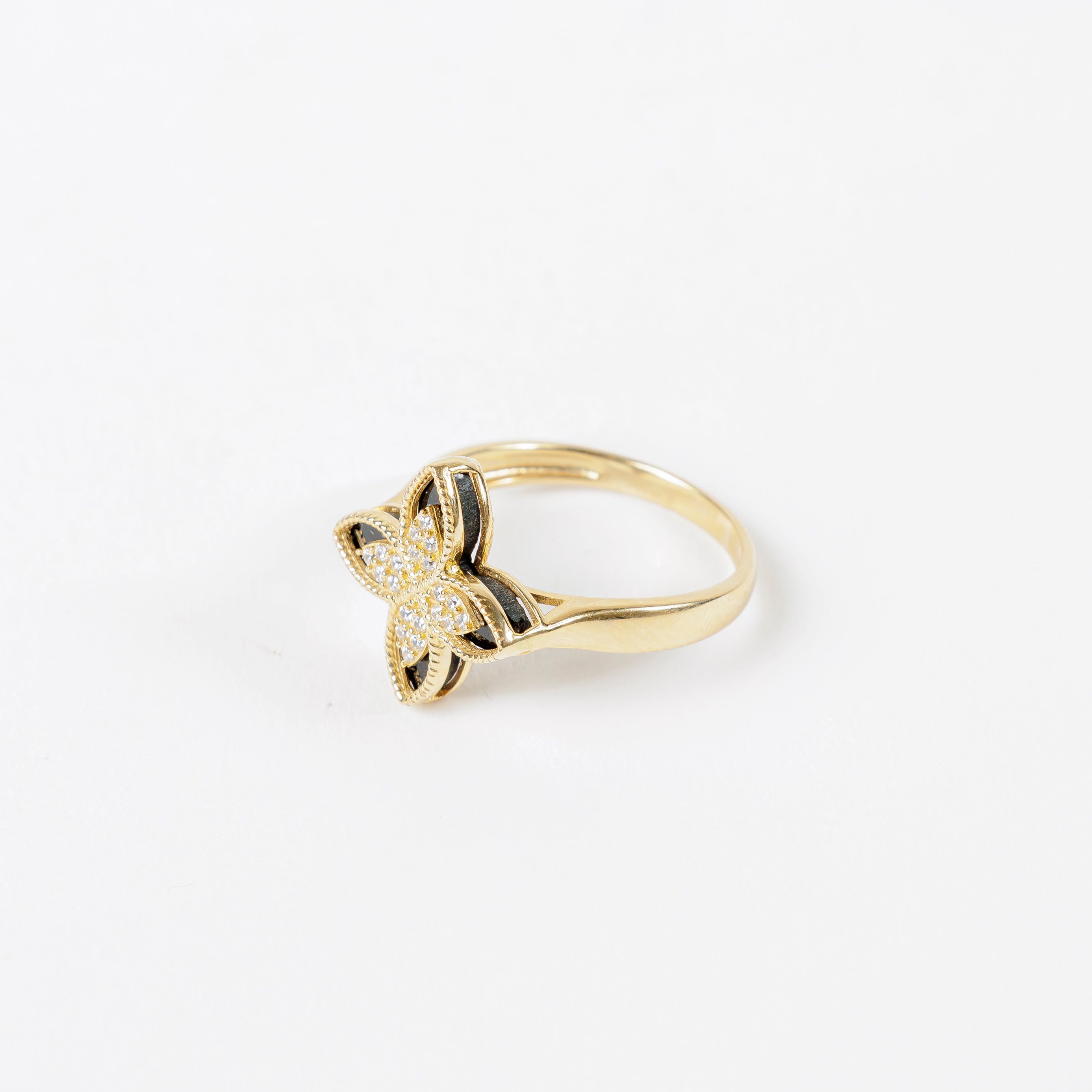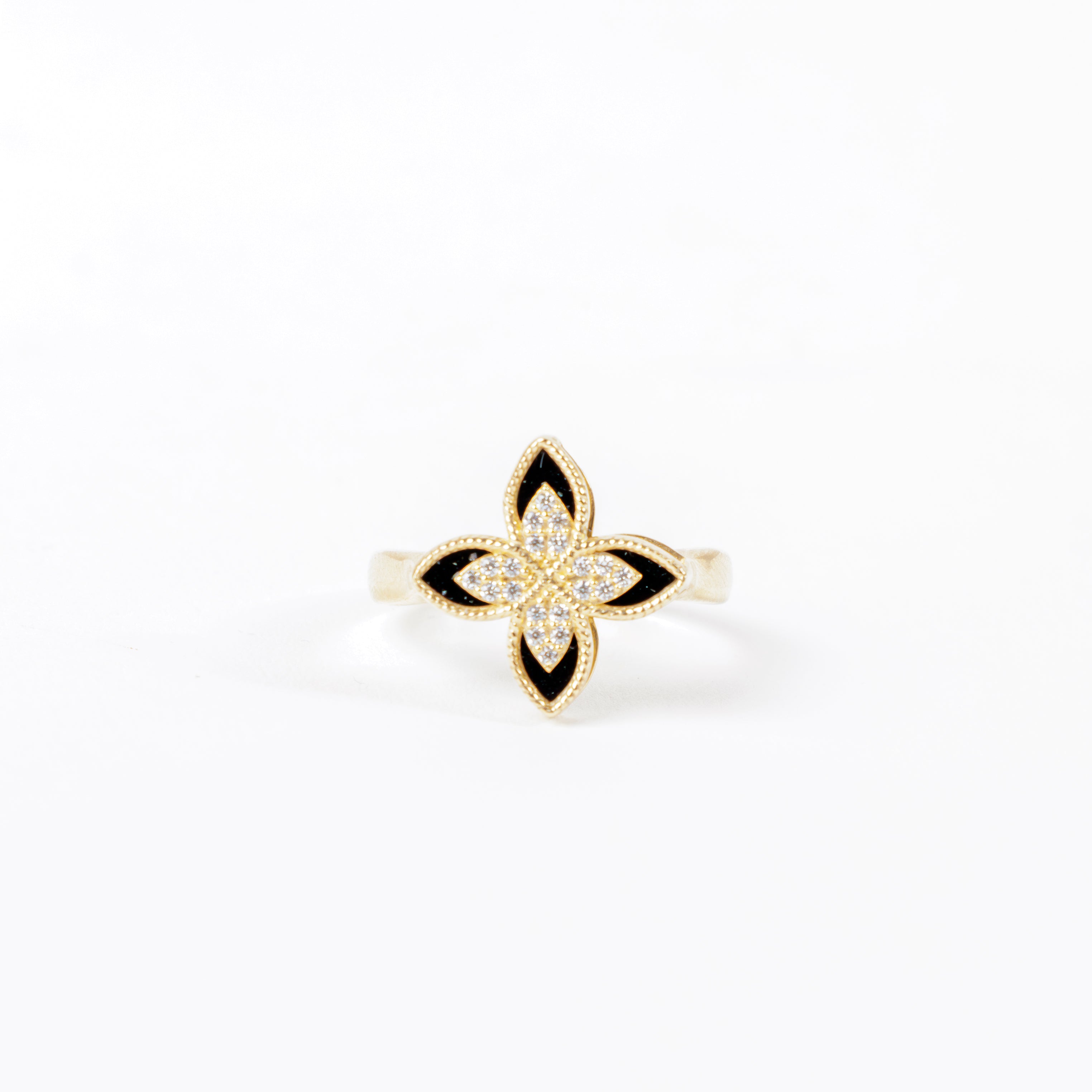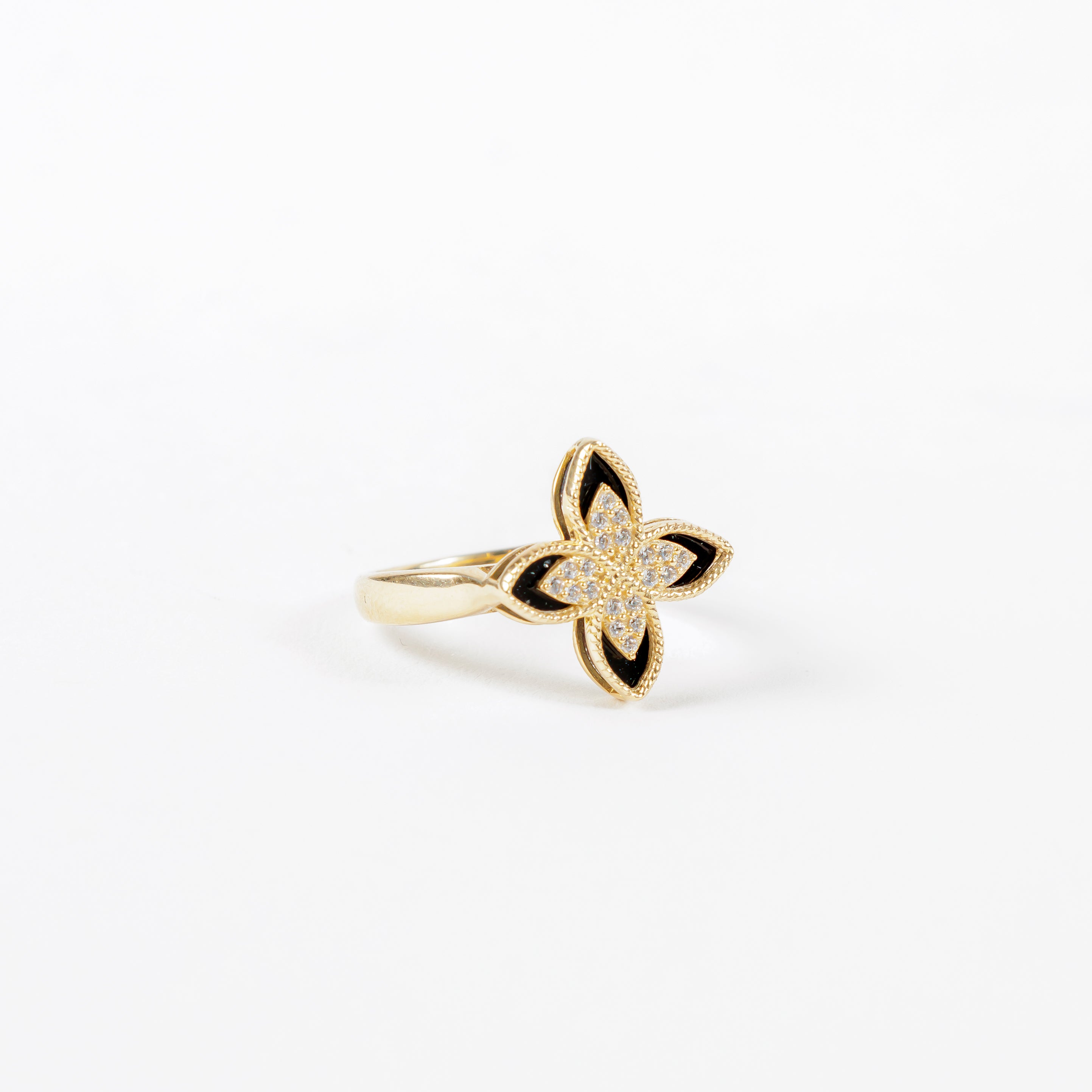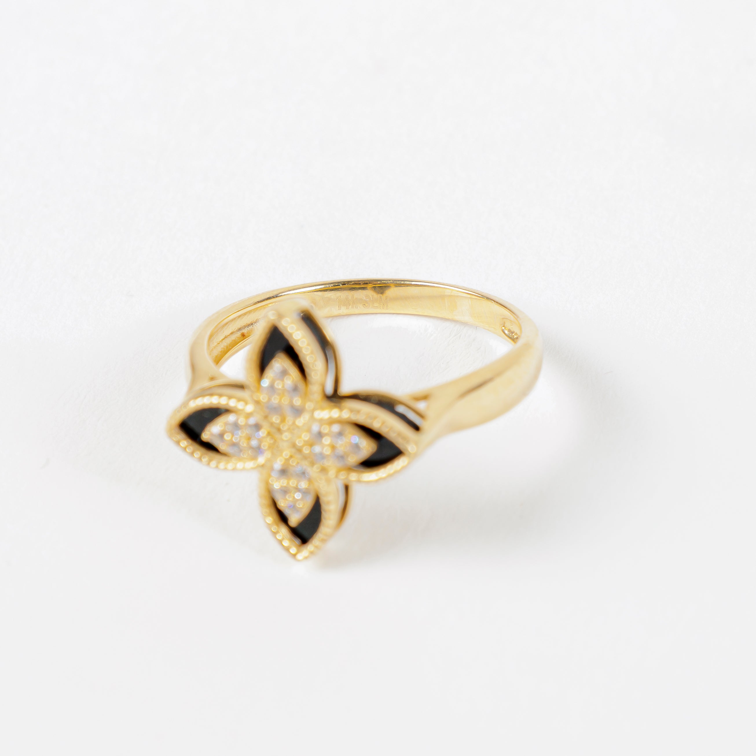 ¡Resplandezca con este hermoso Anillo Flor en Oro de 14K! Con su diseño elegante y en oro amarillo de 14K, este anillo es la combinación perfecta de lujo y estilo. El detalle esmaltado negro añade un toque de sofisticación. No hay mejor manera de agregar un toque de glamour a cualquier atuendo.