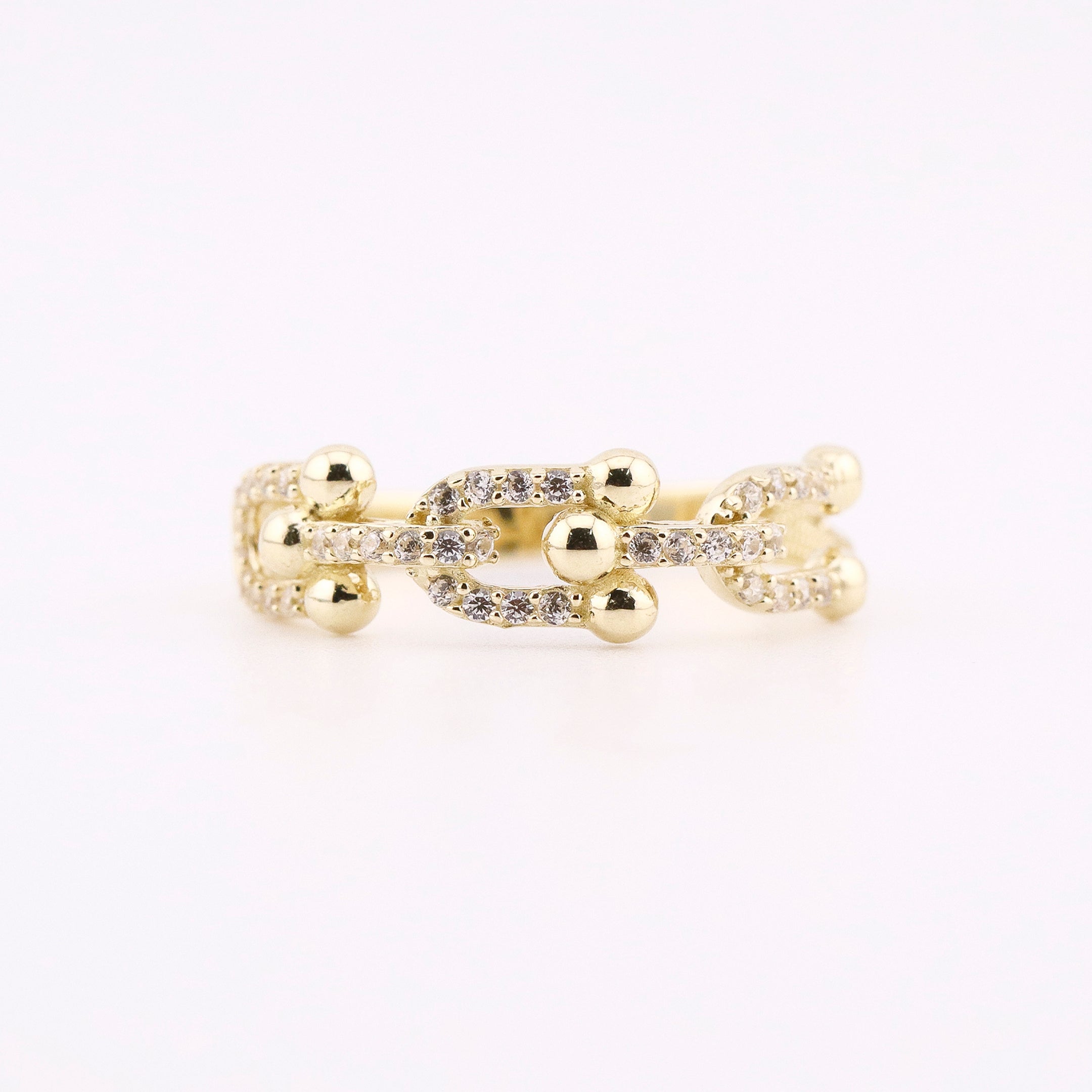 ¡Luce elegante y sofisticada con nuestro impresionante anillo medio enlazado en oro de 14K! Hecho de oro amarillo de alta calidad, cuenta con hermosas piedras blancas que añaden un toque de brillo a cualquier atuendo. ¡Haz una declaración de estilo con este lujoso anillo!