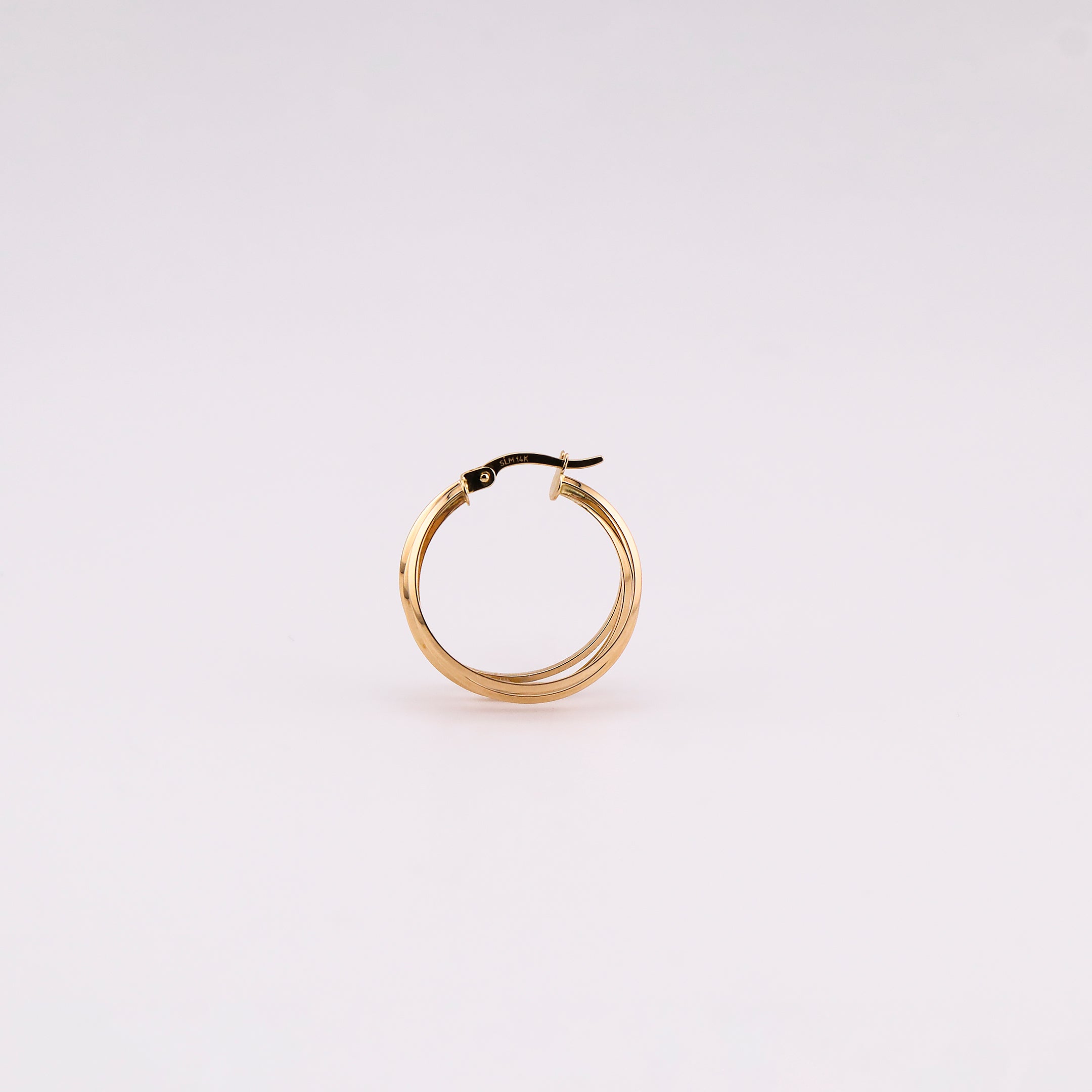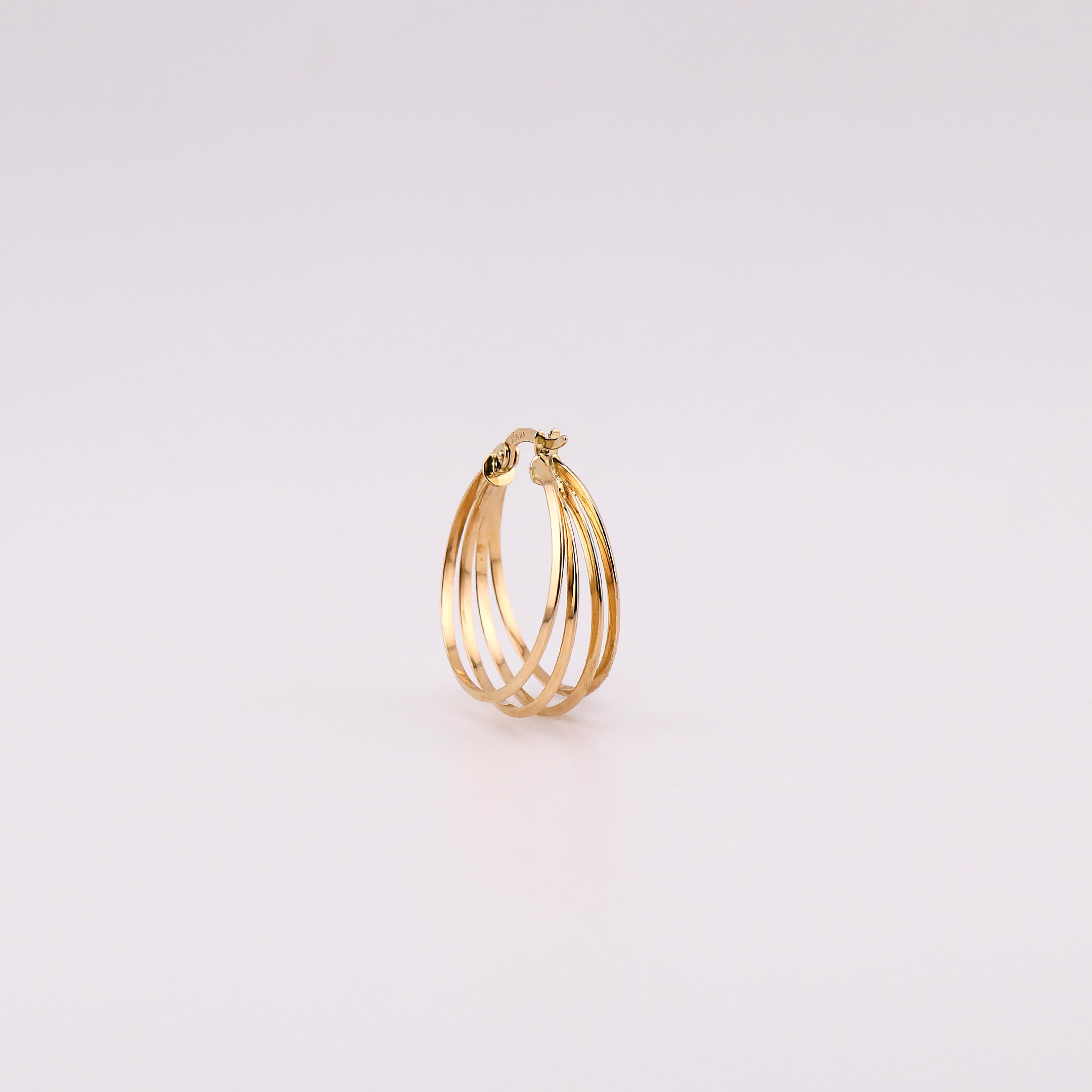 Arracadas Triples en Oro de 14K – un diseño moderno y voluminoso que aporta brillo y presencia. Tres aros entrelazados que reflejan elegancia y estilo contemporáneo.