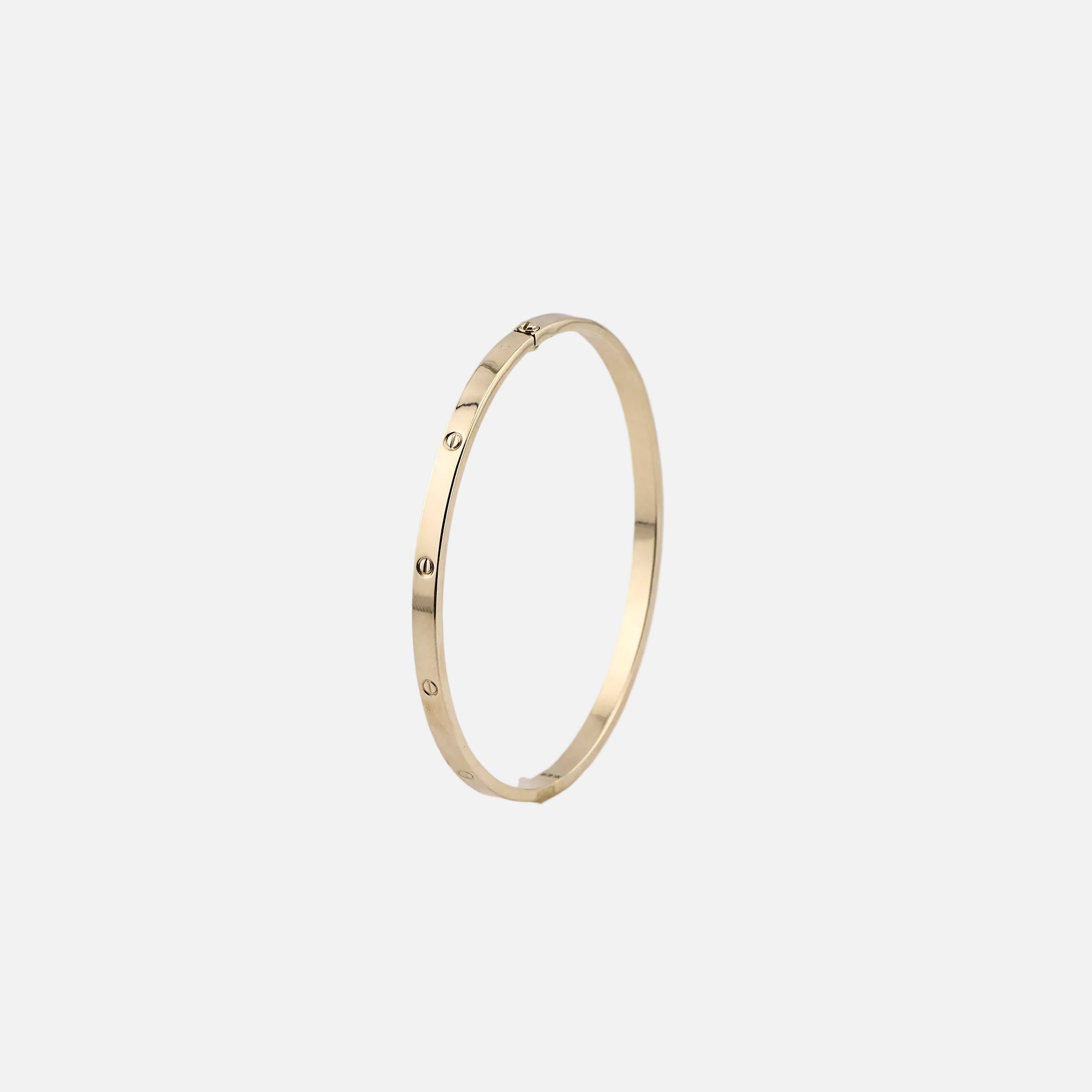Brazalete en oro amarillo de 10K combina elegancia y sofisticación para realzar cualquier look. Su diseño icónico simboliza el amor eterno, mientras que el oro de alta calidad garantiza durabilidad y brillo duradero. Perfecto para quienes buscan una pieza clásica con un toque moderno que destaque en cualquier ocasión.