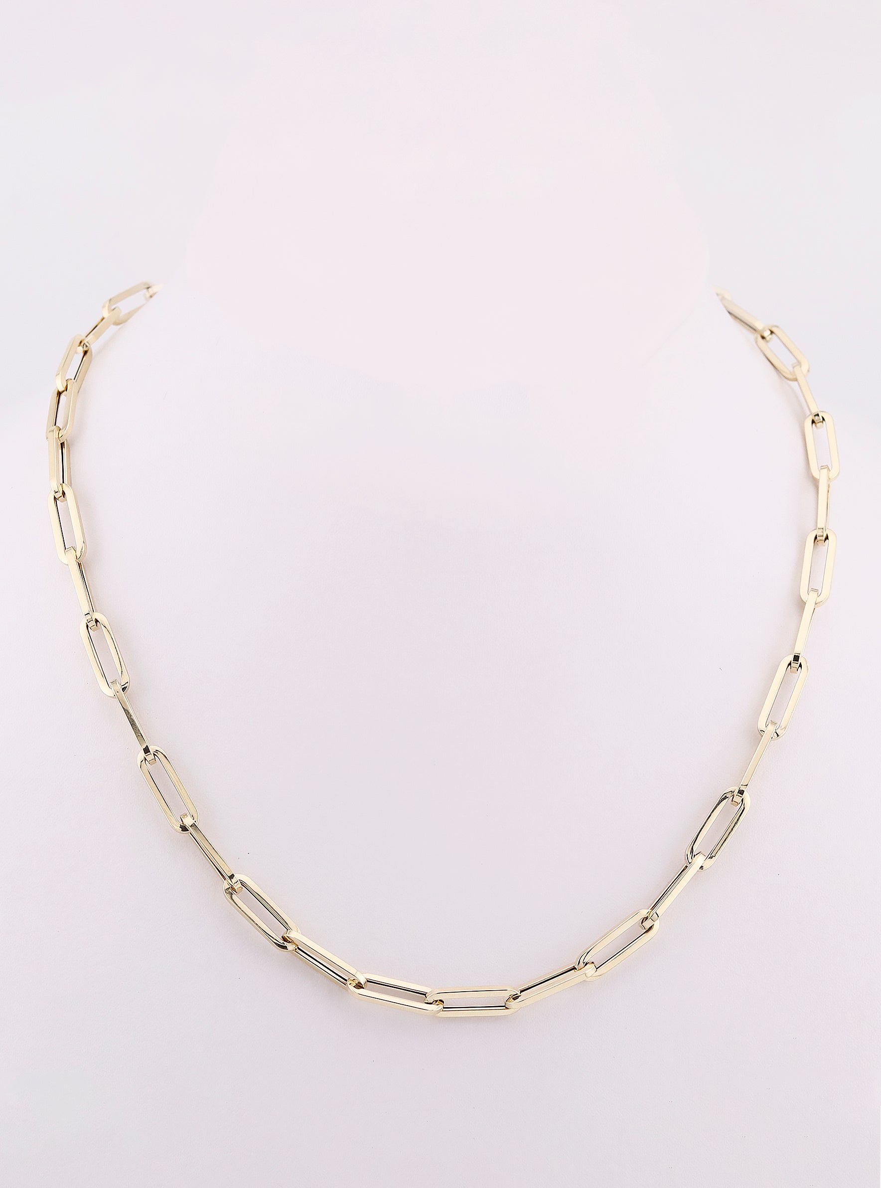 ¡Lleva tu estilo al siguiente nivel con nuestra cadena de oro de 14K con peso de 7.3g! Cada eslabón tiene forma de paper clip, lo que le da un toque único y sofisticado. Hecha con oro amarillo de alta calidad y mide 50cm de largo para complementar cualquier atuendo. ¡Haz una declaración de moda con esta cadena de oro!