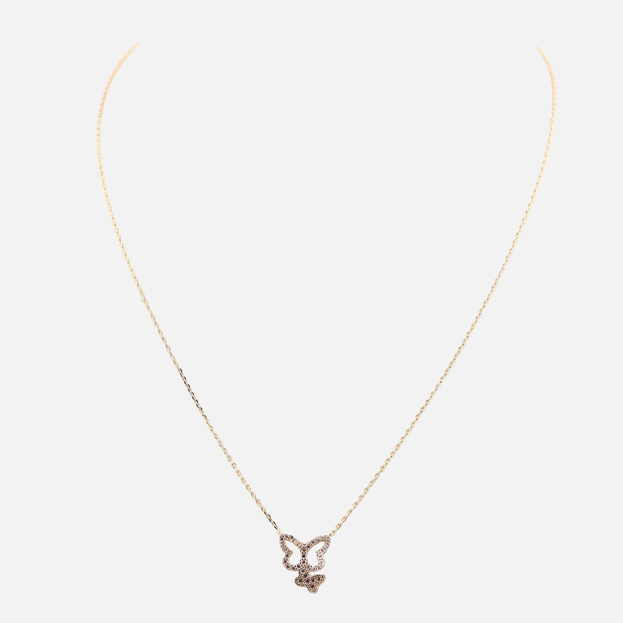 Luce elegancia y delicadeza con esta gargantilla de oro de 10k que presenta un cautivador diseño de doble mariposa adornado con piedras blancas brillantes. Cada detalle está cuidadosamente elaborado para realzar tu belleza natural y añadir un toque de sofisticación a cualquier ocasión. Las mariposas simbolizan transformación y gracia, convirtiéndola en una pieza perfecta para quien busca joyería con significado. Su acabado en oro de 10k garantiza durabilidad y brillo duradero, ideal para uso diario o eventos especiales.
