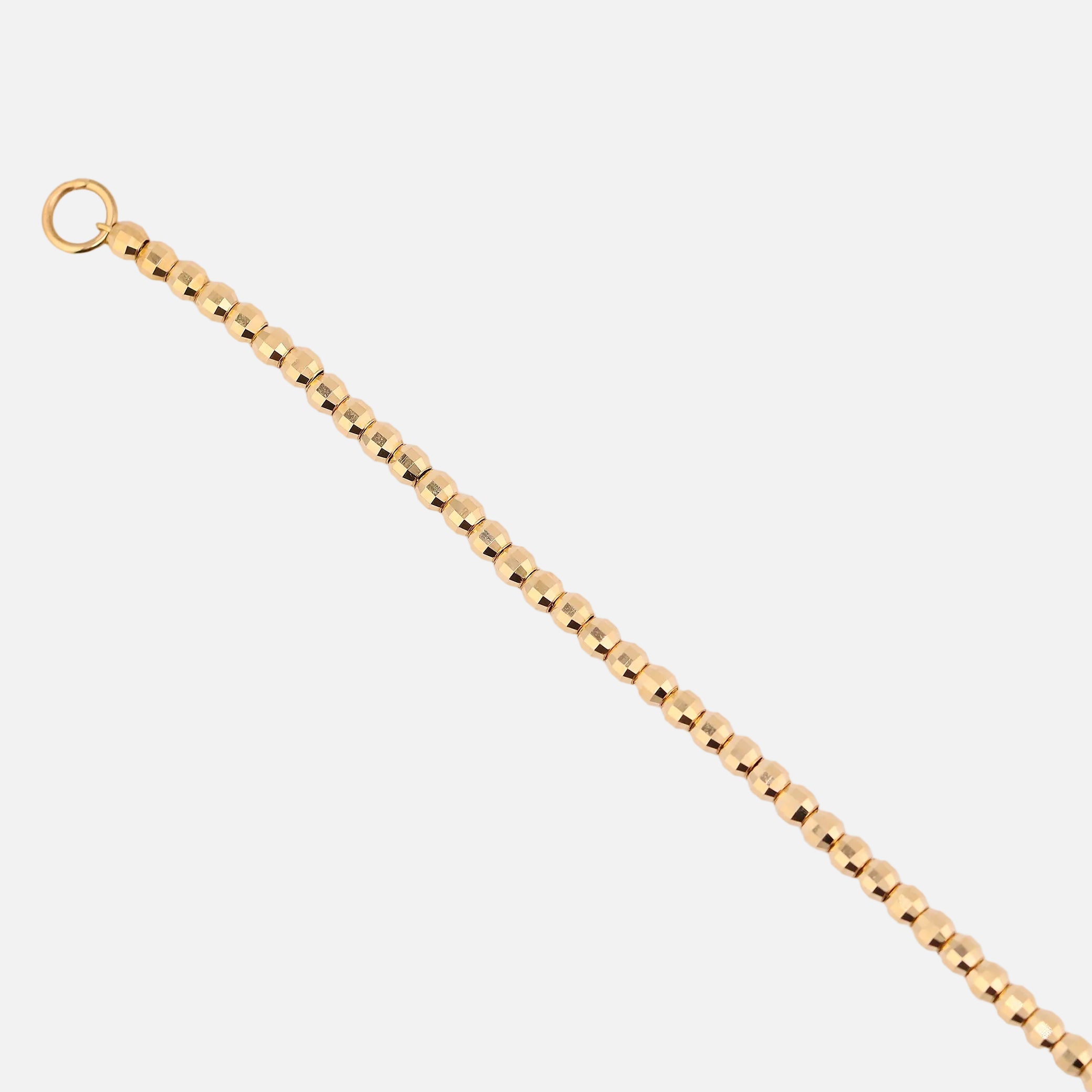 Pulsera elegante confeccionada en oro amarillo de 14K con detalles de borlas que añaden movimiento y sofisticación a tu muñeca. Este diseño versátil combina la calidez del oro con un toque de dinamismo, perfecto para complementar tanto looks casuales como formales. Una pieza que refleja tu buen gusto y se convierte en un accesorio imprescindible en tu colección de joyas.