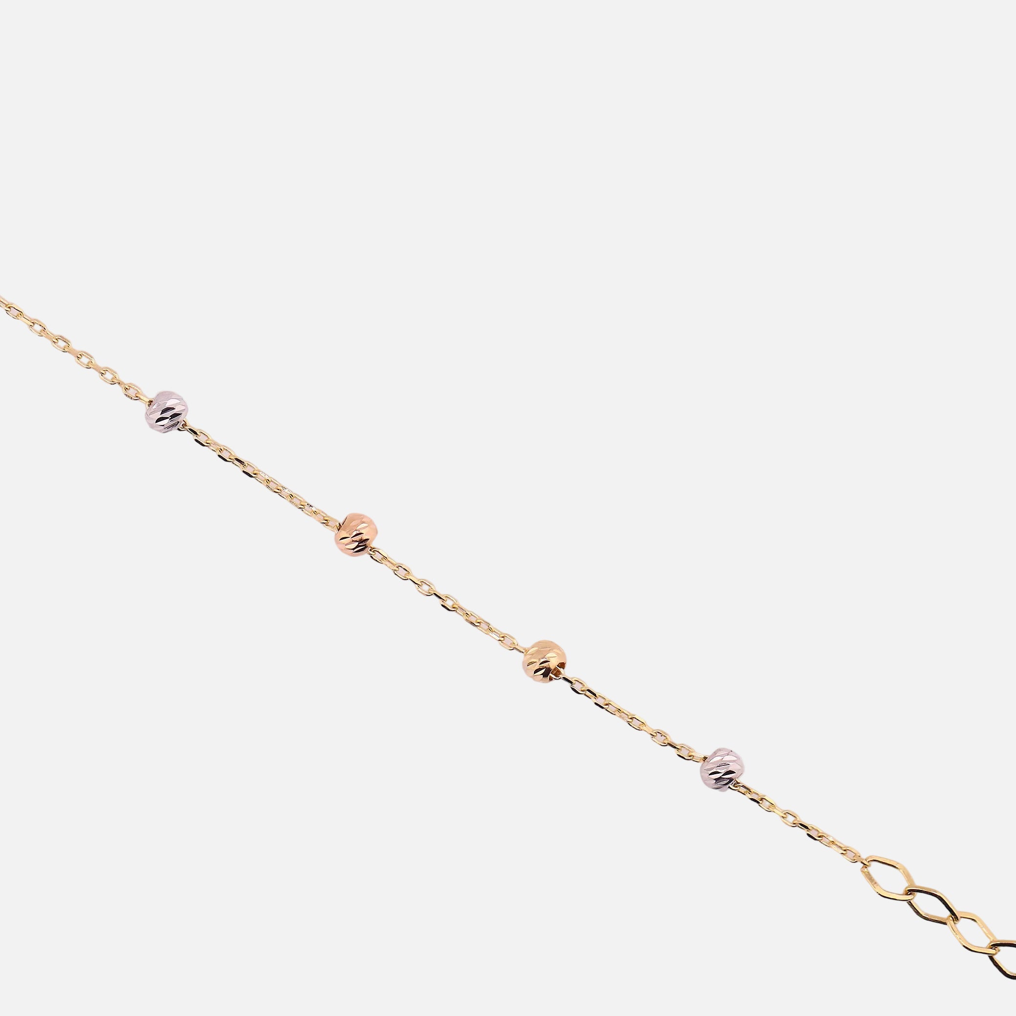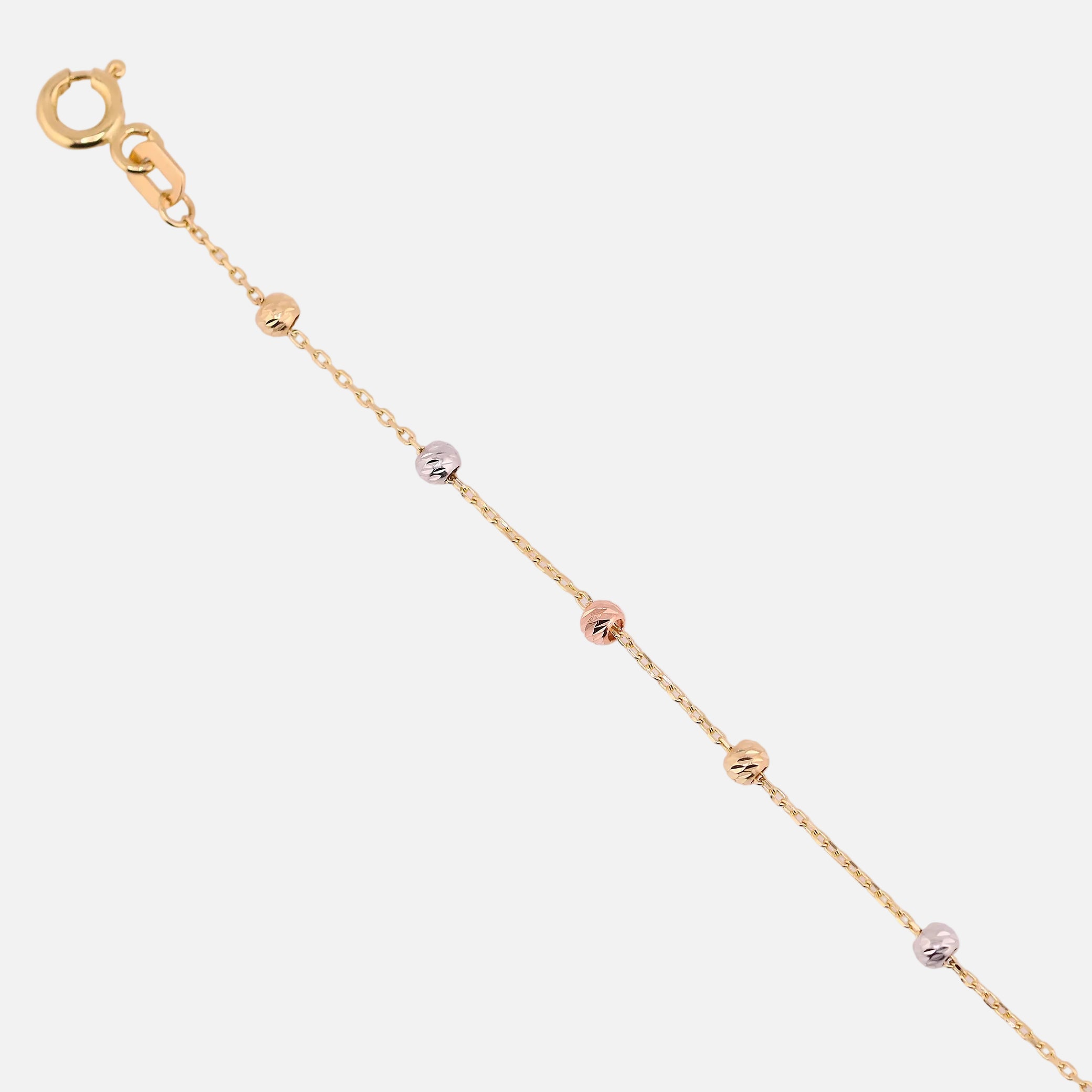 Pulsera elegante confeccionada en oro de tres tonos de 14K con detalles de borlas que añaden movimiento y sofisticación a tu muñeca. Este diseño versátil combina la calidez del oro con un toque de dinamismo, perfecto para complementar tanto looks casuales como formales. Una pieza que refleja tu buen gusto y se convierte en un accesorio imprescindible en tu colección de joyas.