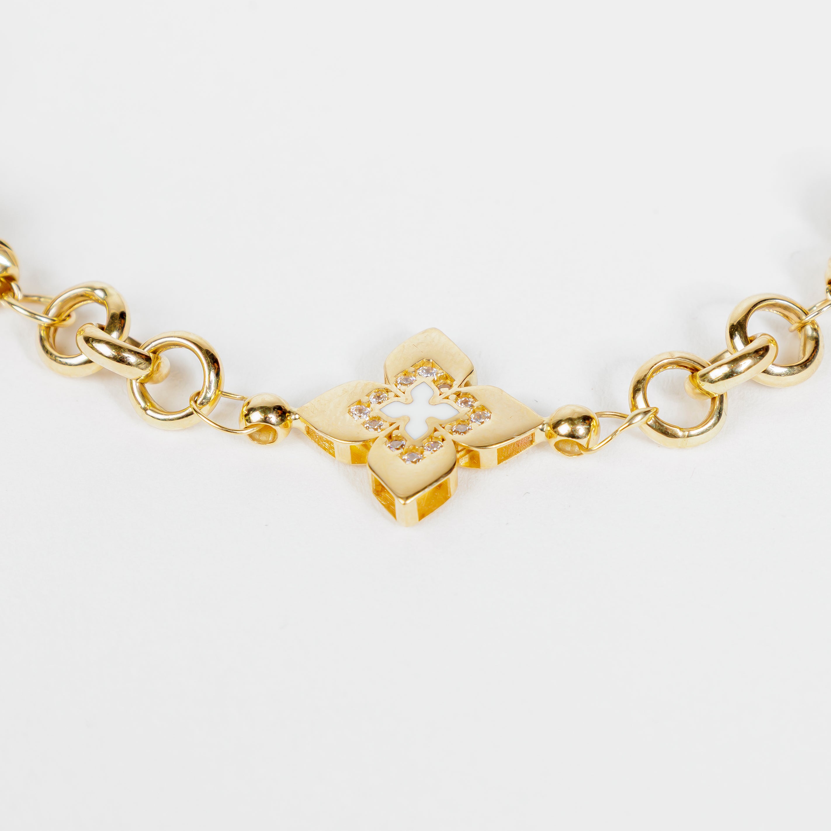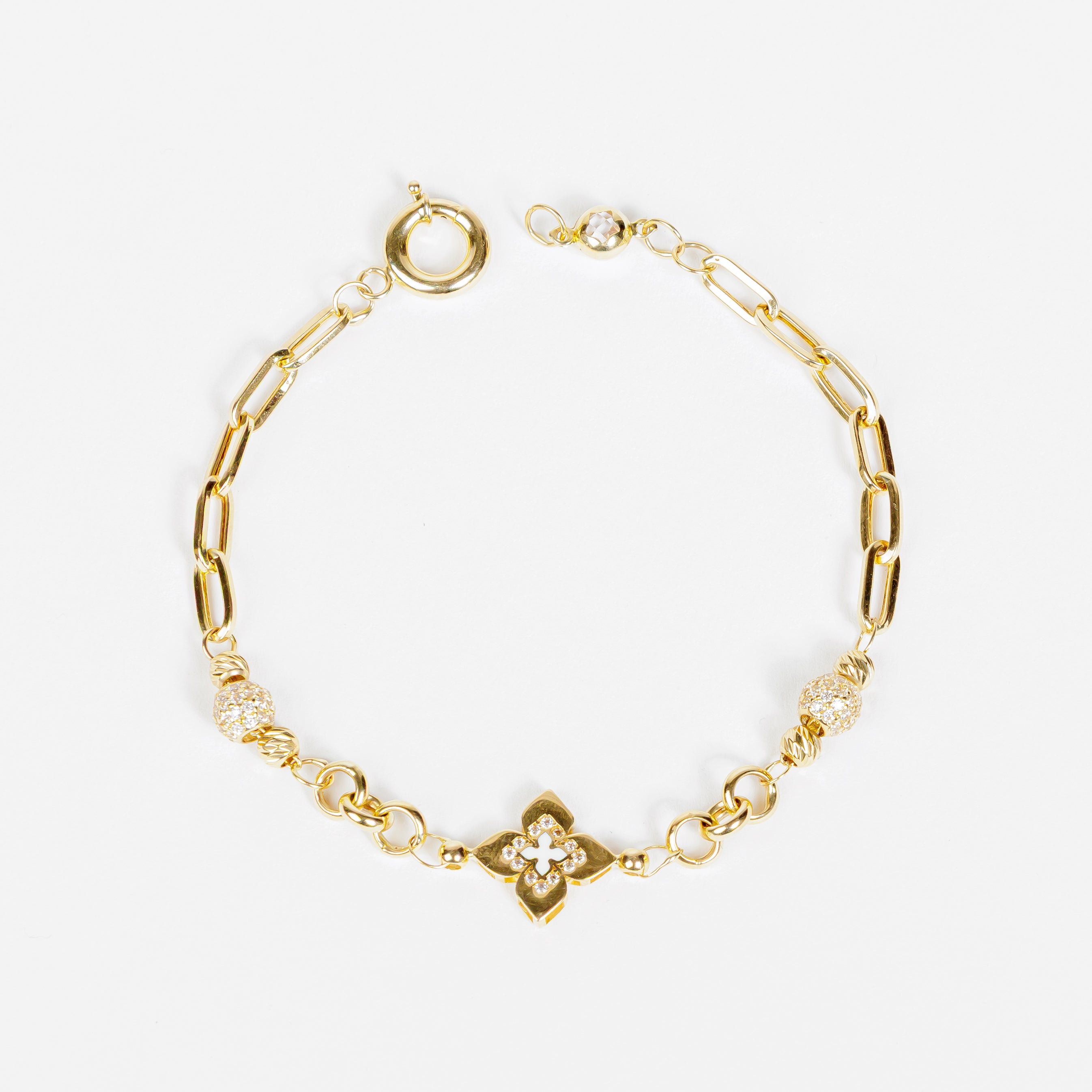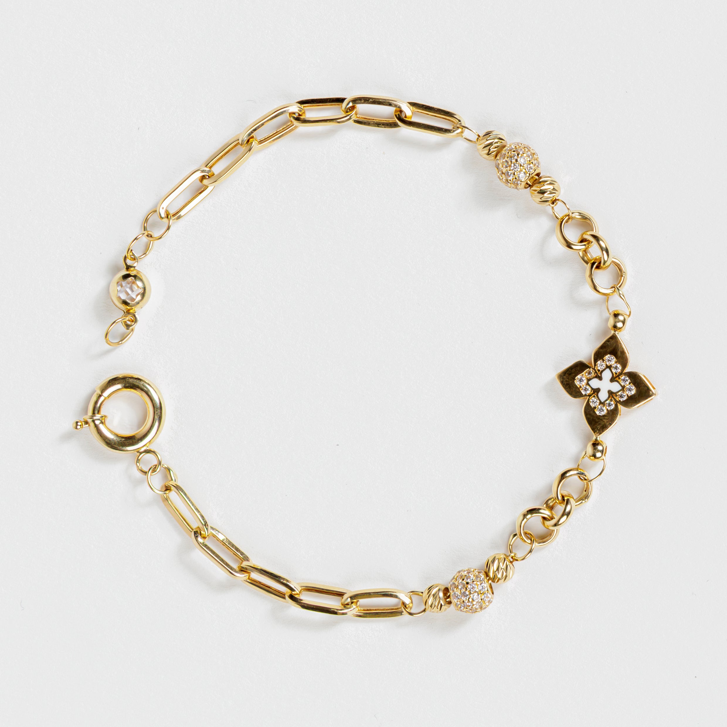 Esta pulsera dije flor de oro de 14K es el accesorio perfecto para añadir elegancia y sofisticación a cualquier atuendo. Fabricada en oro amarillo de alta calidad, cuenta con un diseño inspirado en la icónica marca de lujo con detalles esmaltados blancos. ¡Hazte con la tuya y marca estilo!