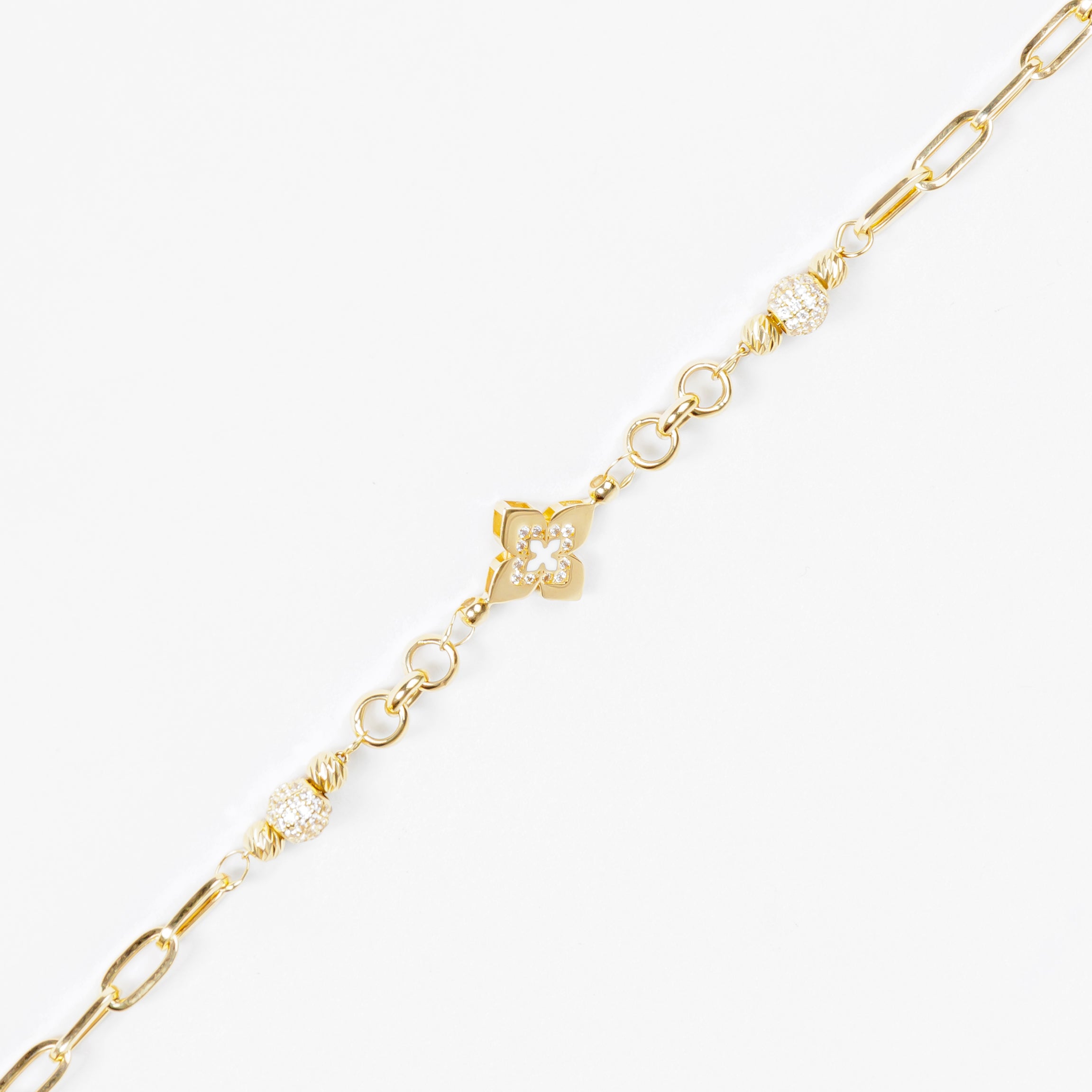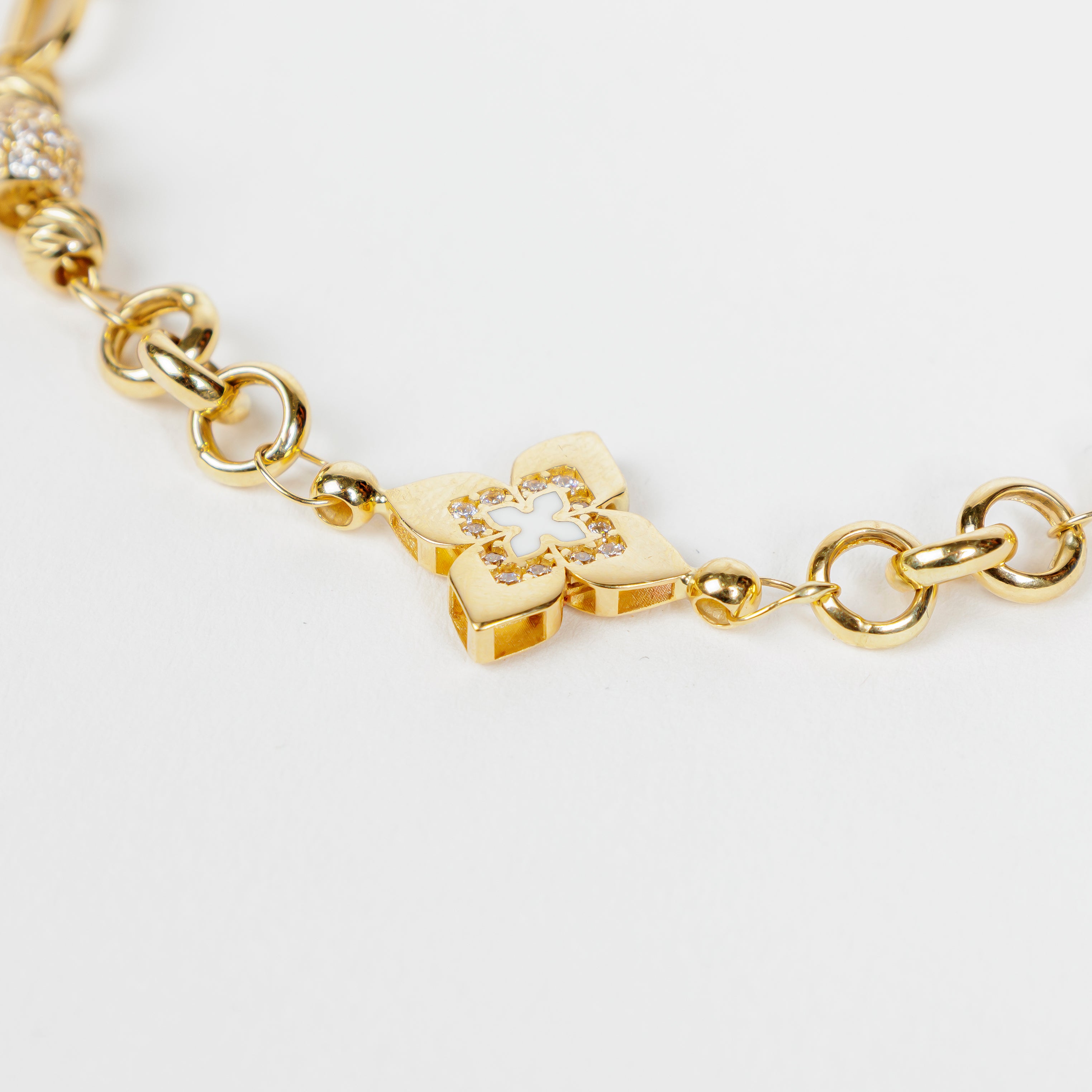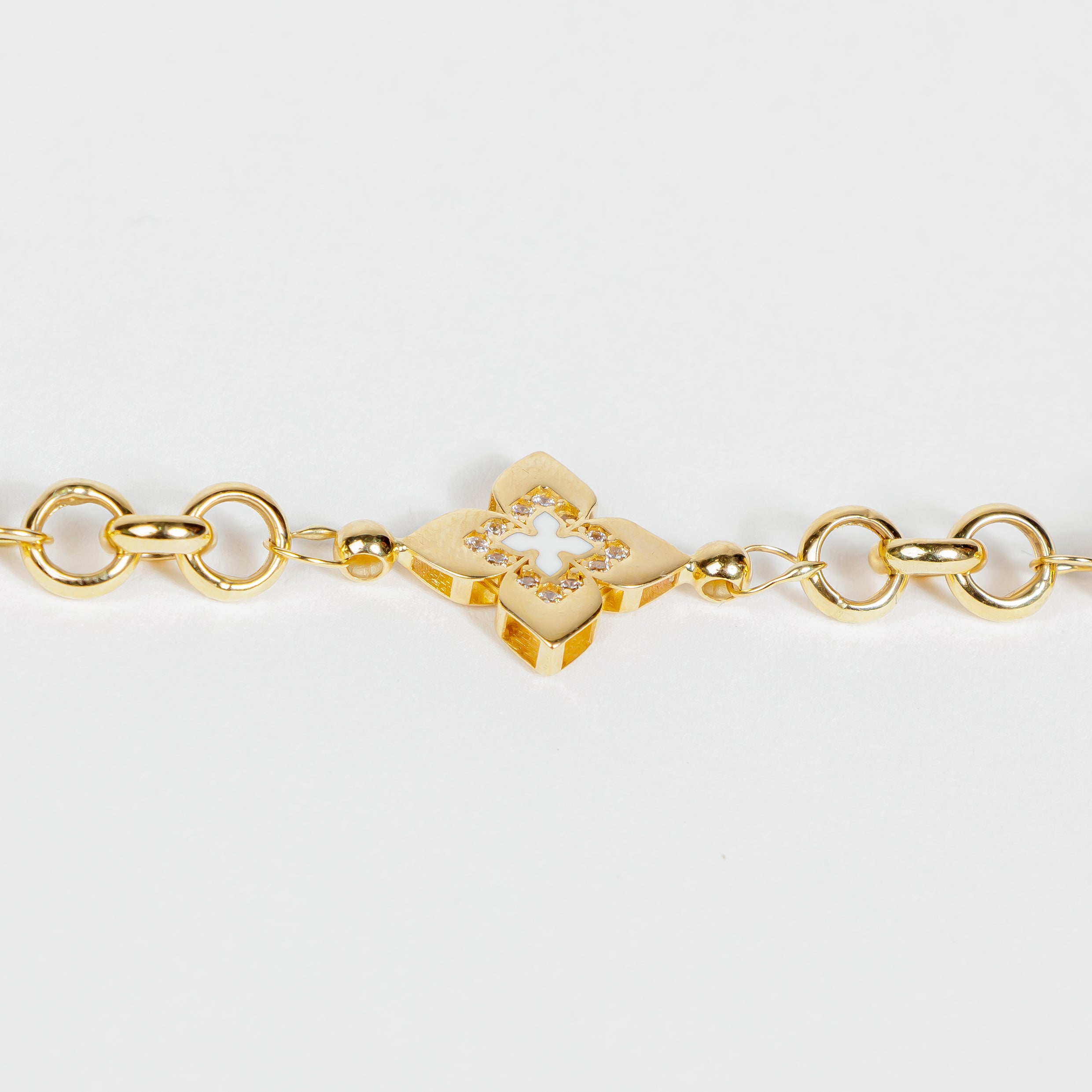 Esta pulsera dije flor de oro de 14K es el accesorio perfecto para añadir elegancia y sofisticación a cualquier atuendo. Fabricada en oro amarillo de alta calidad, cuenta con un diseño inspirado en la icónica marca de lujo con detalles esmaltados blancos. ¡Hazte con la tuya y marca estilo!