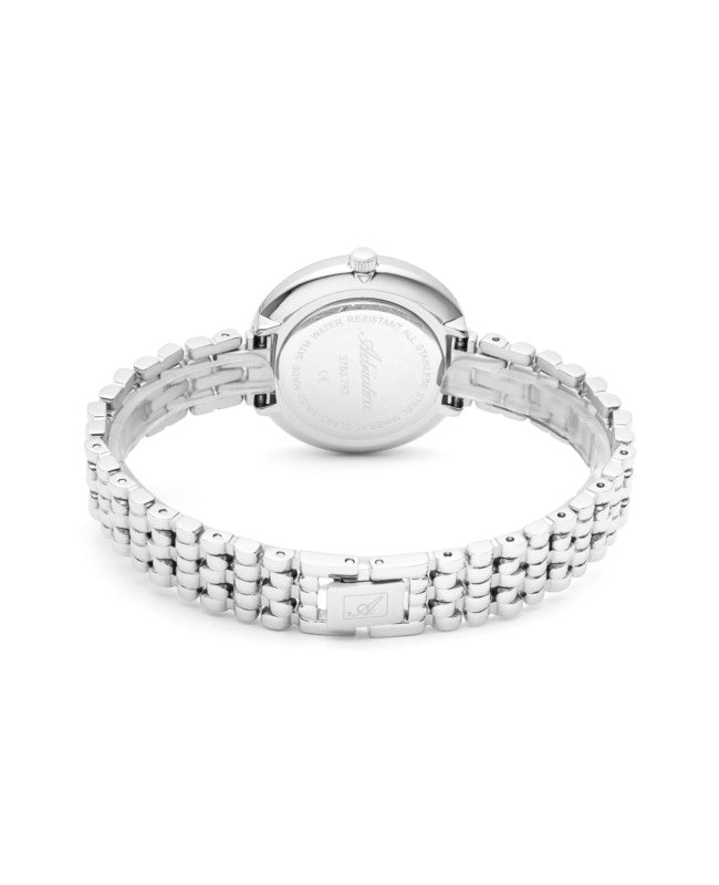 Reloj Adriatica Essence para dama. Fabricado en acero inoxidable con carátula gris grafito y trébol plateado al centro. Movimiento suizo Ronda 763, cristal mineral y diseño elegante Swiss Made.