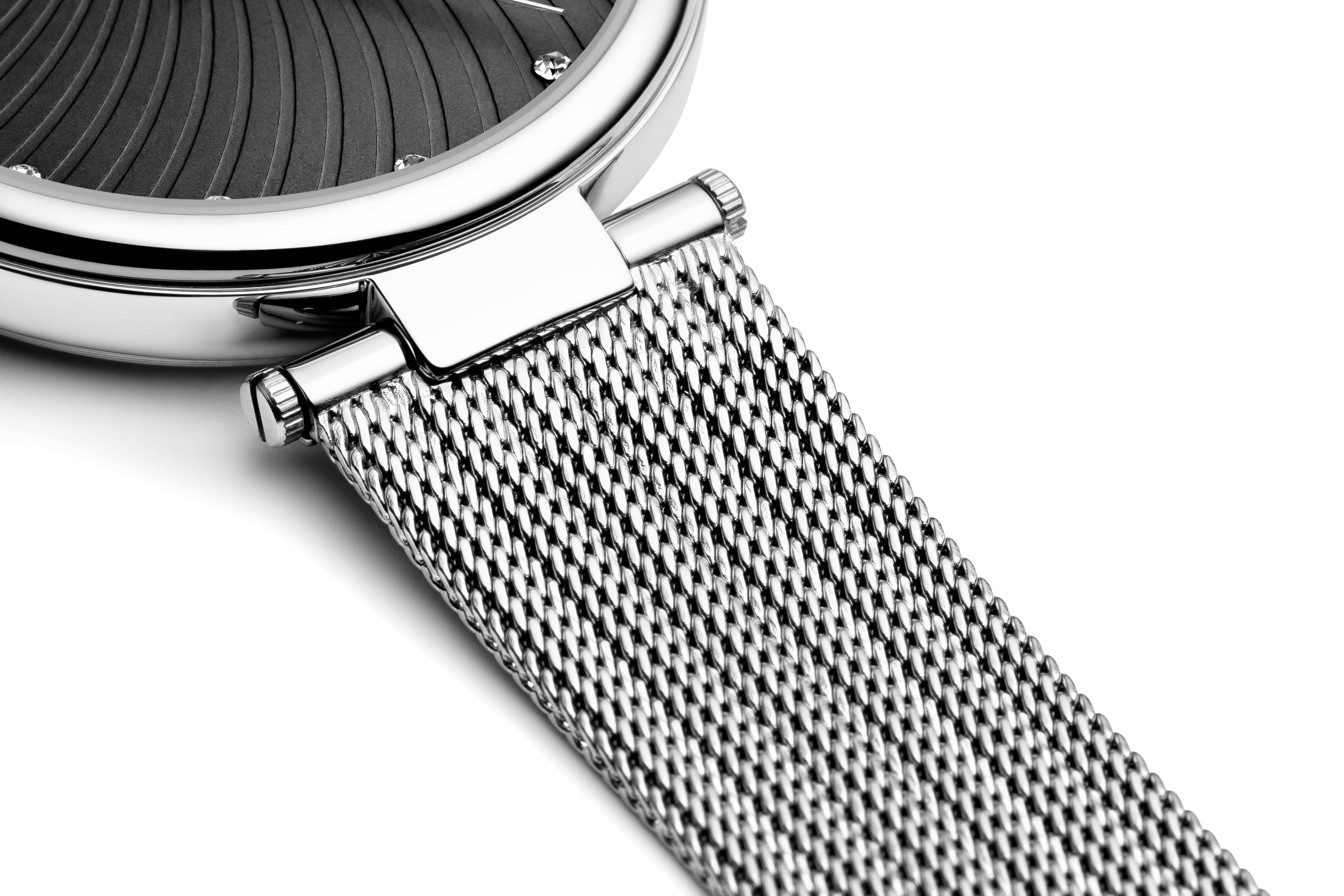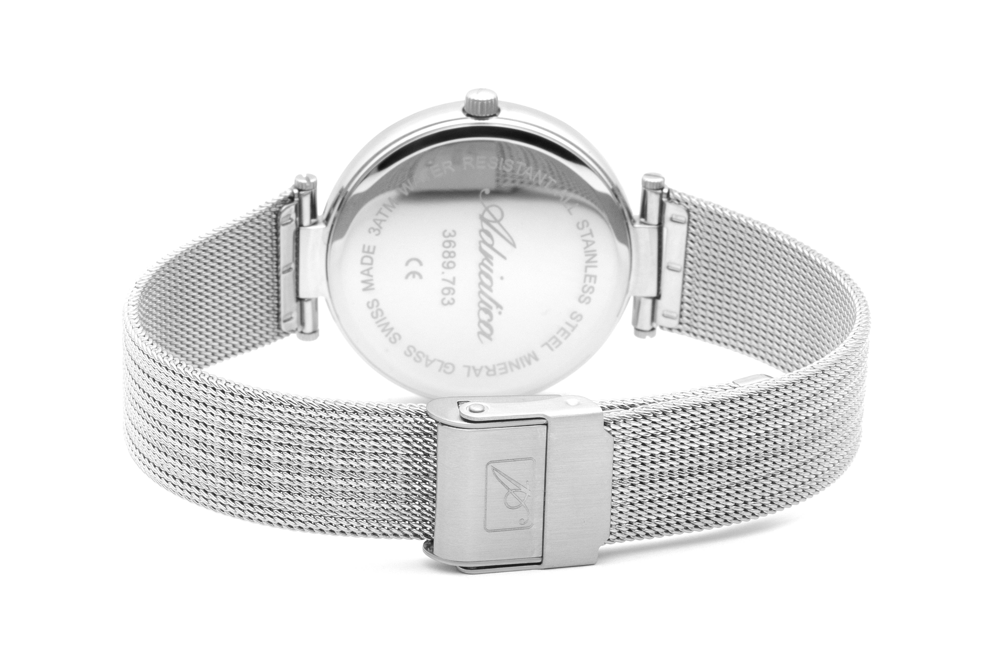 Reloj Adriatica Milano para dama. Caja y malla metálica de acero inoxidable con carátula gris grafito adornada con circonias. Movimiento suizo Ronda 763, cristal mineral y elegancia Swiss Made.