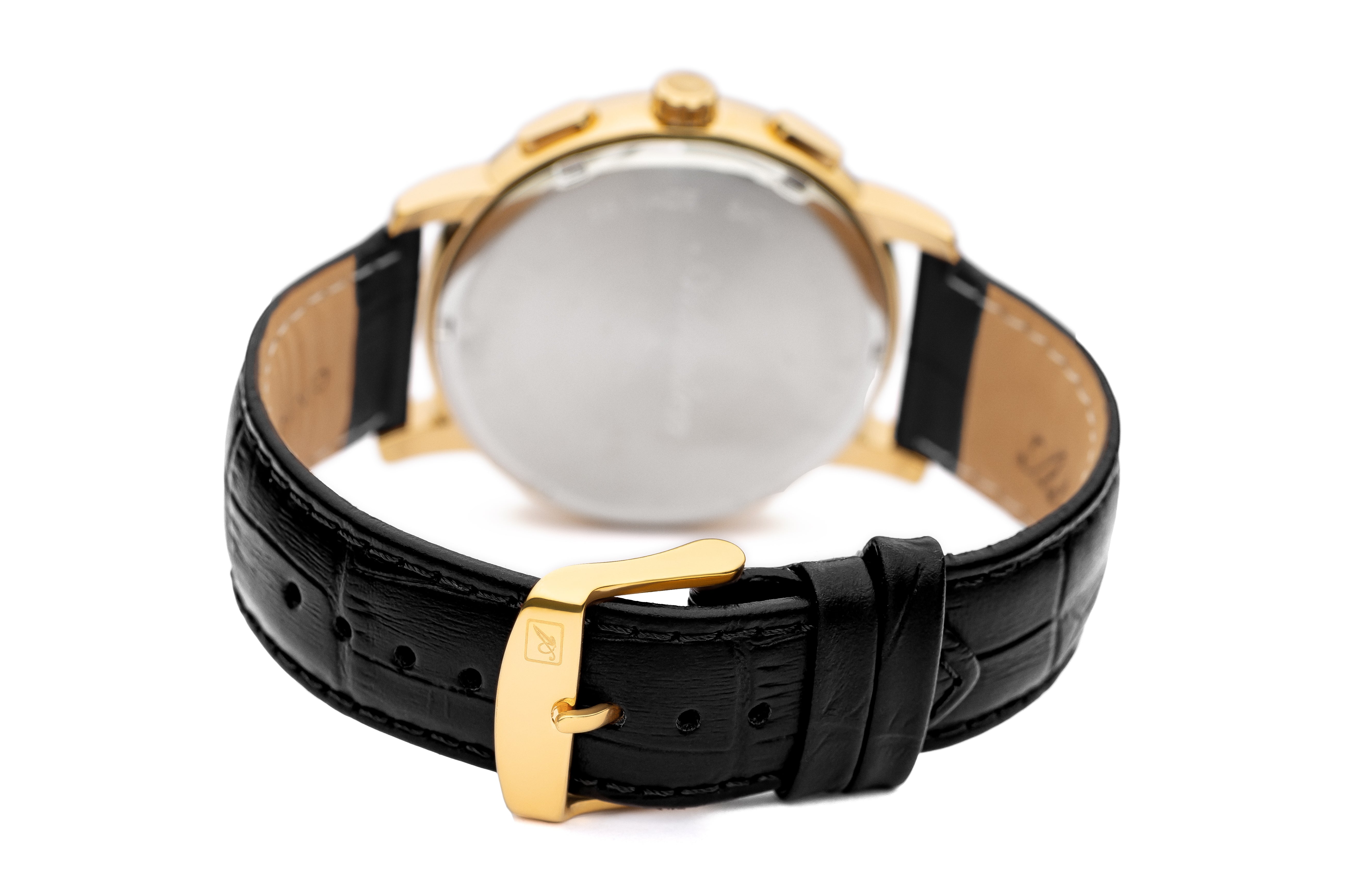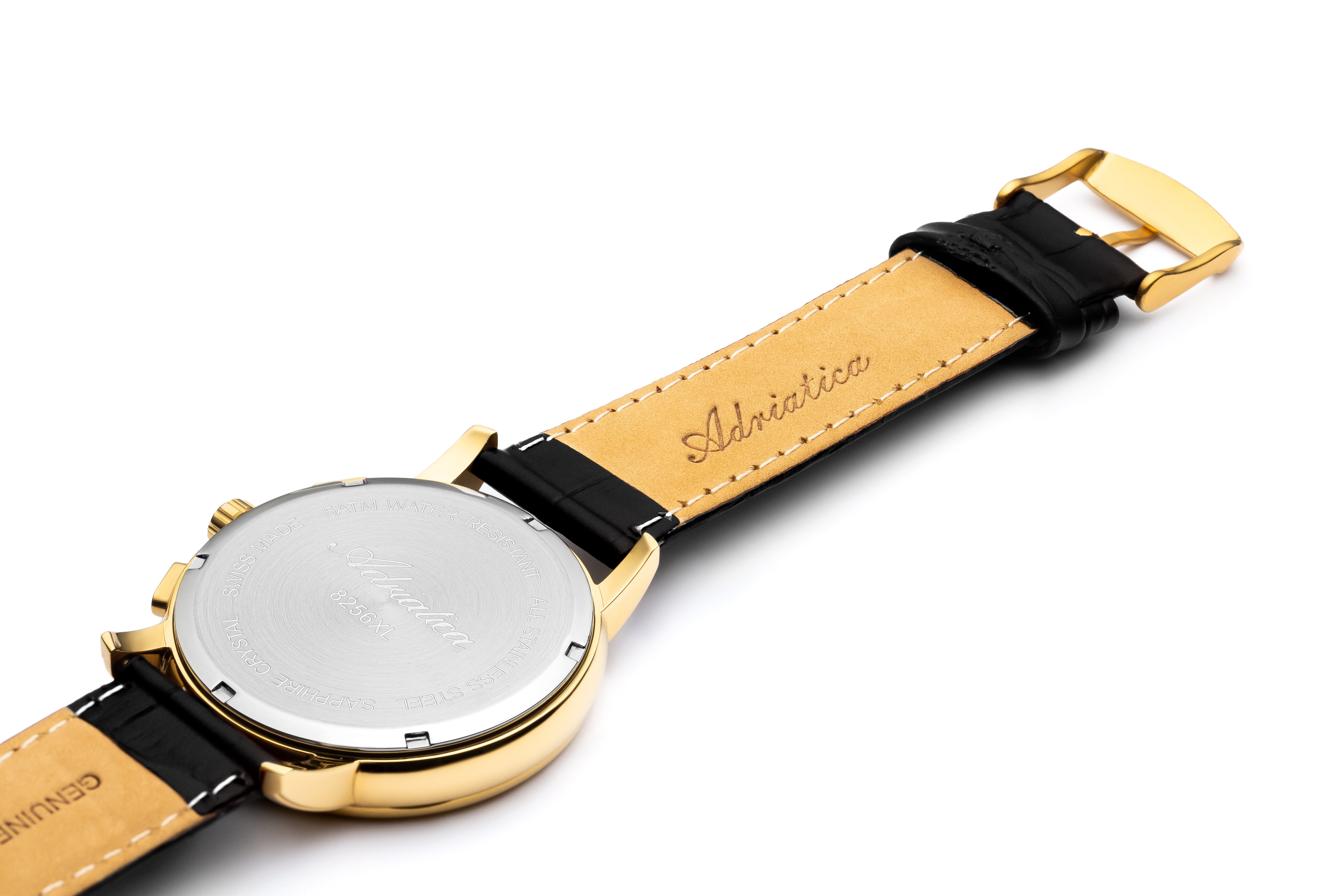 Reloj Adriatica Passion para caballero. Cronógrafo dorado con caja PVD y correa de piel negra estilo cocodrilo. Movimiento suizo Ronda 5030, cristal de zafiro y diseño elegante Swiss Made.