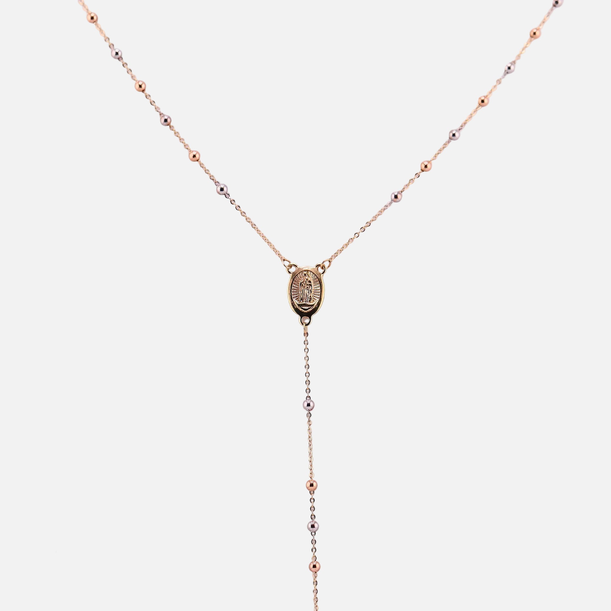 Rosario de oro 10K que combina tres tonos en una sola pieza, creando un diseño elegante y versátil. Con una longitud de 45cm, se adapta perfectamente a cualquier ocasión, desde lo cotidiano hasta momentos especiales. El oro 10K garantiza durabilidad y brillo duradero, mientras que la combinación de tonos añade sofisticación y permite que se adapte a tu estilo personal. Una joya que trasciende el tiempo, ideal para quien busca calidad y belleza en una sola prenda.
